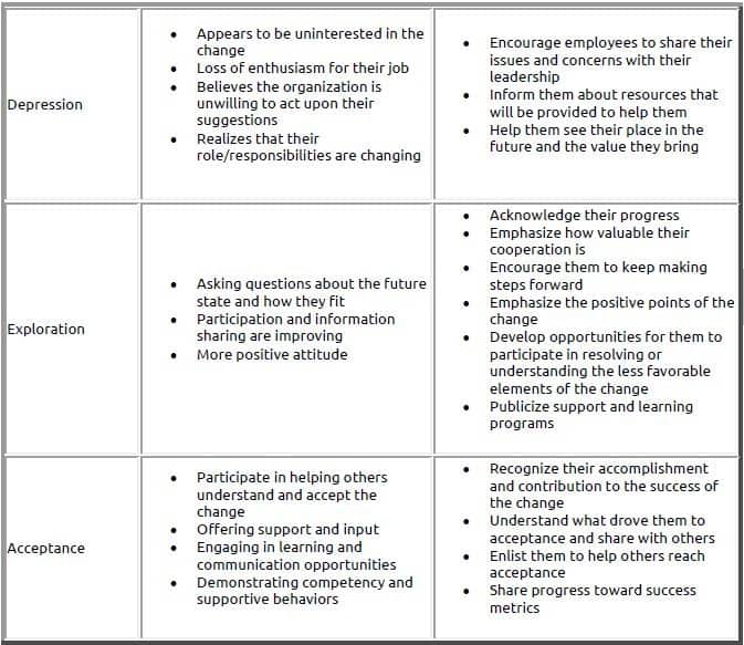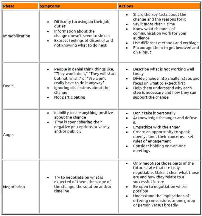 Understanding the emotional phases that people may experience can help you decide what to do next. Building upon the great work of Dr. Kubler-Ross, here is our interpretation of the emotional phases people experience during changes and actions you can take to move them toward acceptance:
